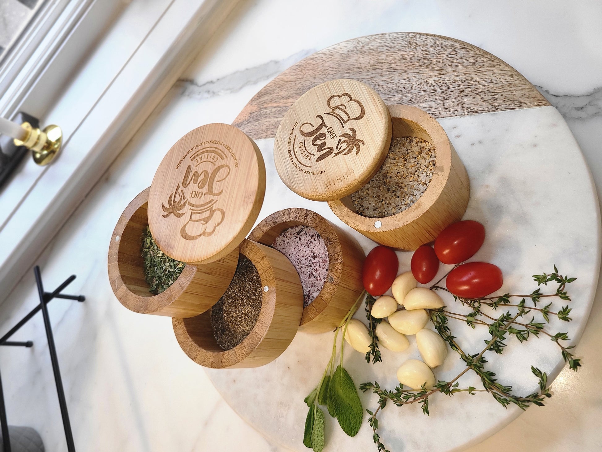 A Triple Threat: keep three favorite seasoning, herb or salt choices all conveniently at hand on your countertop with this multi-level bamboo cellar.