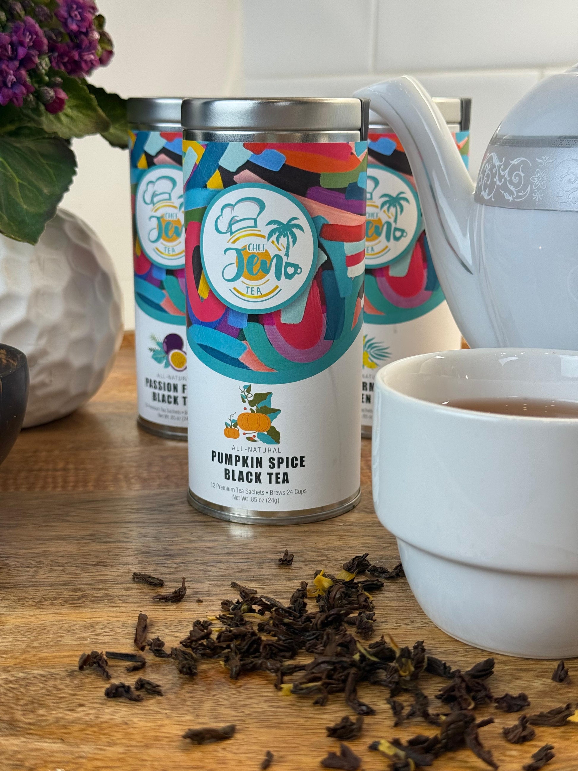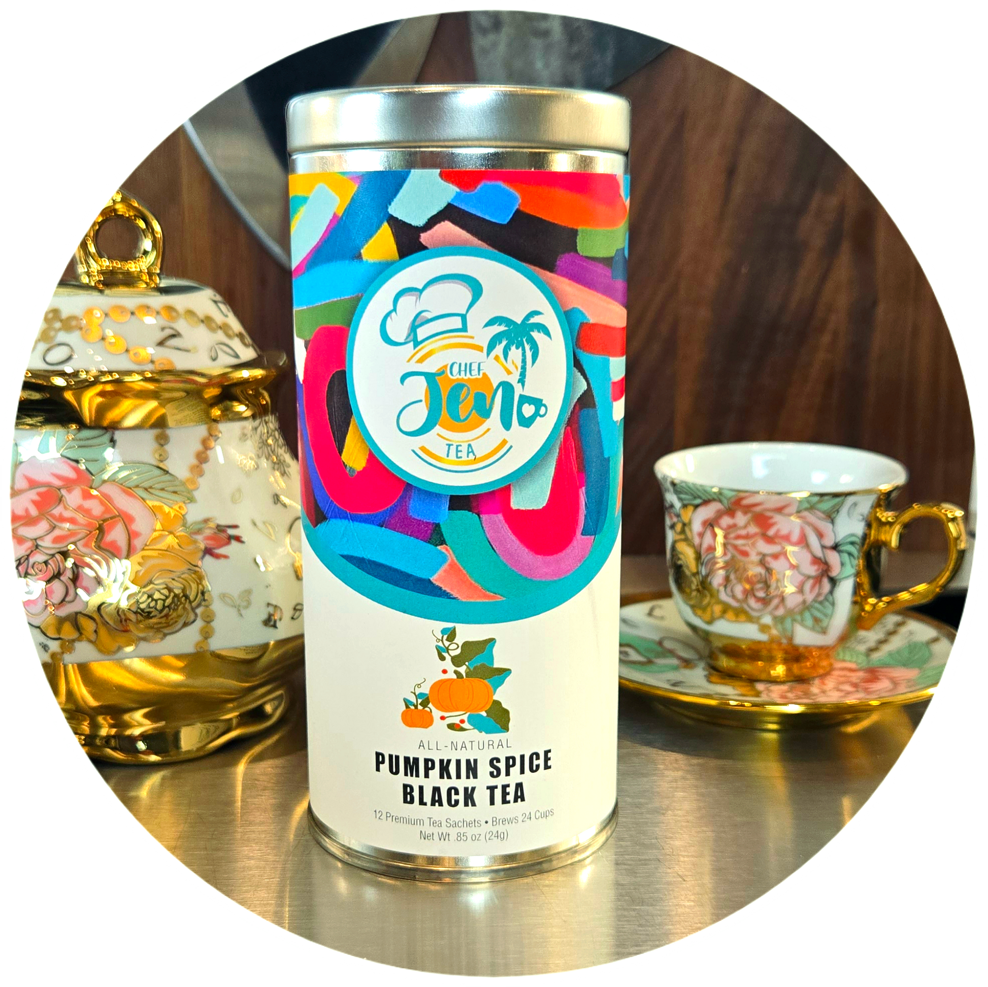 Pu’er tea, Assam tea, Cinnamon, Ginger, Cloves, Cardamom, Pumpkin Spice, All- Natural Vanilla Creme Flavor, Contains Caffeine